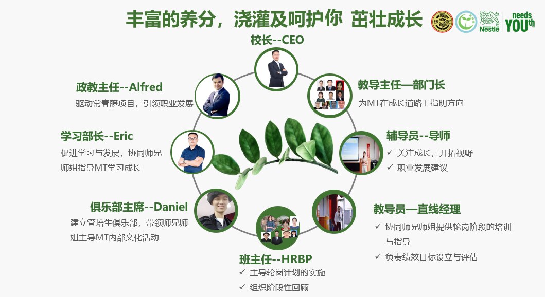 在校园氛围的培育下,管培生将如常春藤般不断汲取养分,攀援向上,最终成长为在 任 何 时 候 都 能 绽 放 光 彩 的 青 年 人 才(Youth)。