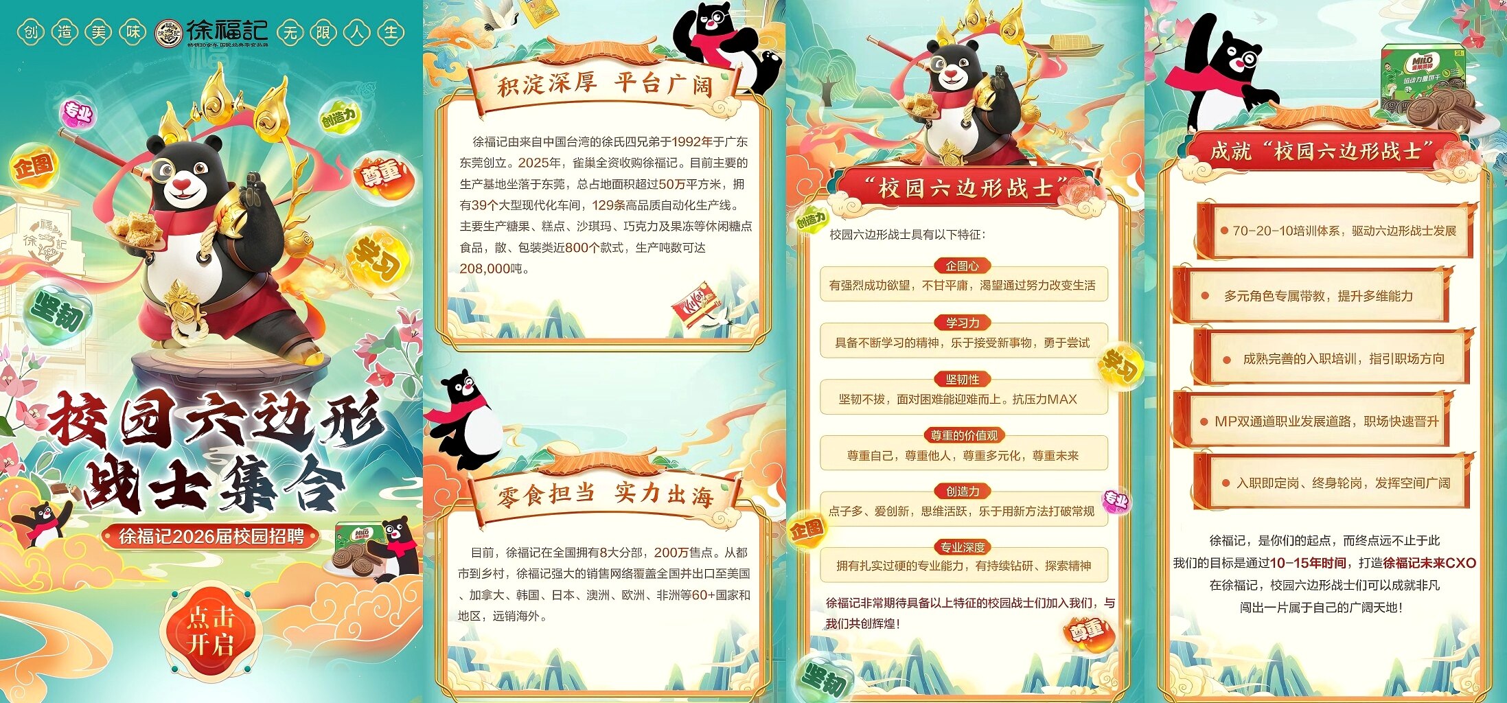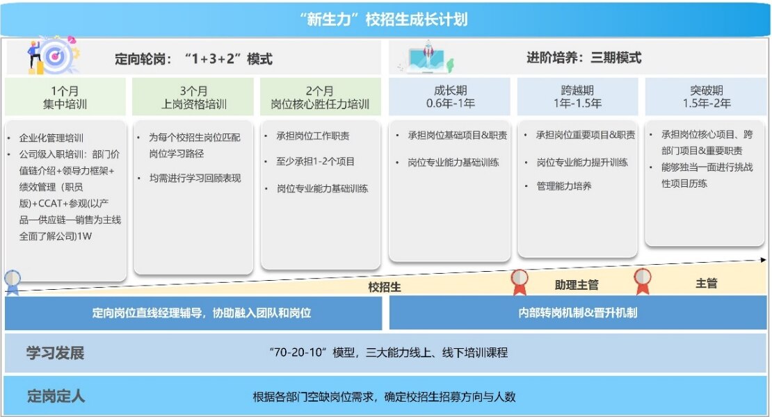 即将开启人生新程的少年们,心怀理想,对未来充满昂扬斗志。为了更好地为职场新人们指引前路,助力人才快速成长,徐福记为每位管培生量身定制成长计划——常春藤项目。设立校长、政教主任、教导主任、辅导员、教导员、班主任、学习部长、文娱部长 8 大角色。在校长的引领下,政教系和教导系两大职能将分别从职业发展、人生导向为管培生提供丰厚的资源。围绕“70-20-10”量身定制专业学习发展项目,设定轮岗期以推动管培生在不同部门与项目中进行学习与锻炼。
