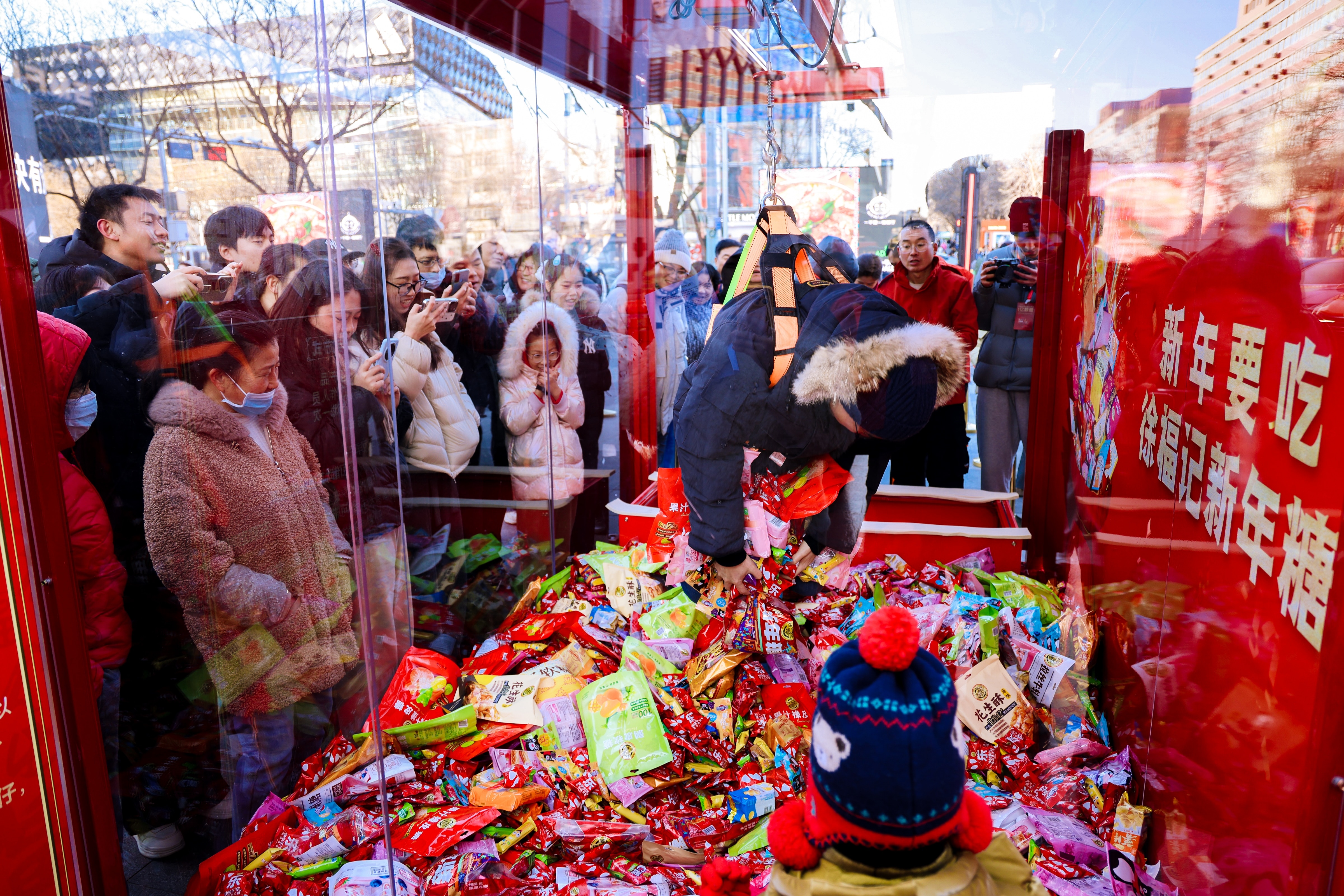 最受欢迎的是“巨型真人新年糖娃娃机”,消费者可以亲身进入游戏装置,用自己的身体抓取丰富的产品,享受“抓多少送多少”的惊喜。刚从装置里出来的年轻人抱着满满一怀的糖果,兴奋地和同伴分享:“太有意思了!快帮我拍照,我要发朋友圈分享这份快乐。”