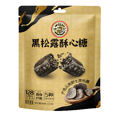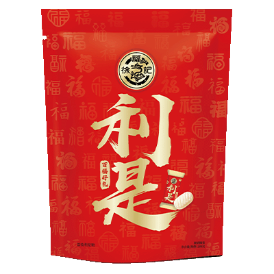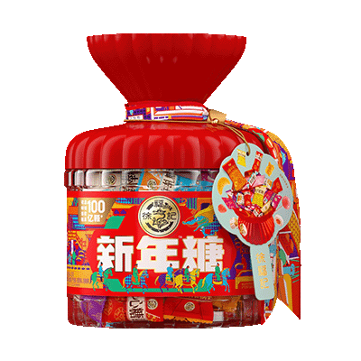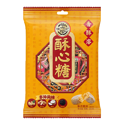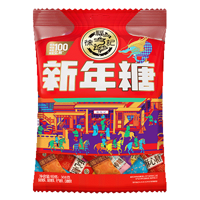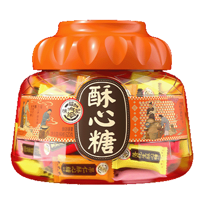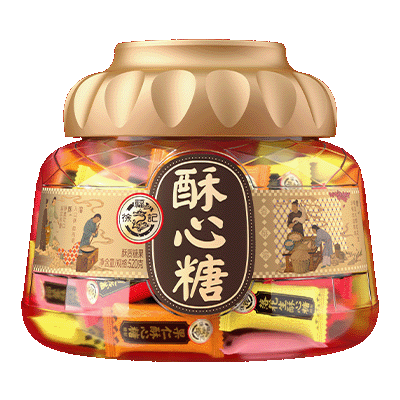 酥心糖袋/桶在制作工艺上,酥心糖升级了传统“拉糖”和“包馅”工艺,层数从最初的64层提升至128层,口感更酥脆、层次更丰富,入口即溶。这一工艺突破既保留了传统风味,又提升了食用体验。包装设计上,徐福记再度携手潘虎设计团队,以东方吉祥器物聚宝盆为灵感,打造寓意纳福聚财的糖桶造型。旋盖处的十六片绽放花瓣,取“一六(路)顺”谐音吉意,腰身饰以典雅中式插画,巧妙融入传统制糖工艺场景,既彰显匠心工艺,也尽显品牌深厚的文化底蕴。酥心糖袋/桶- 酥心糖袋/桶